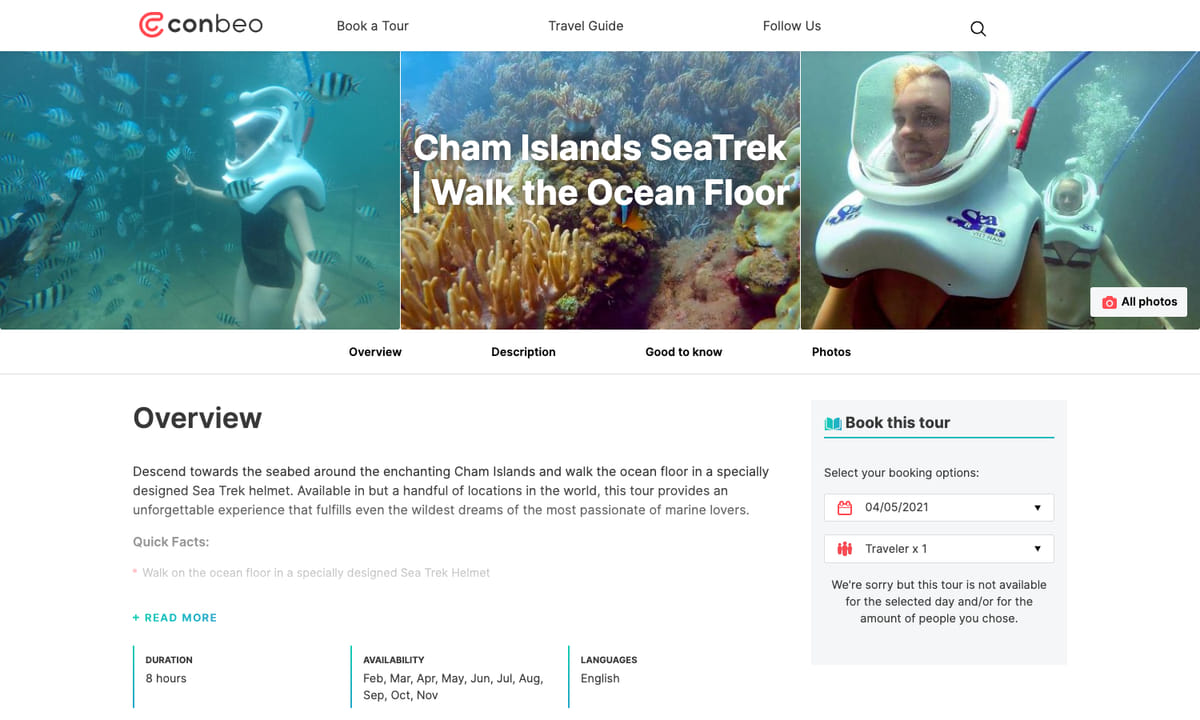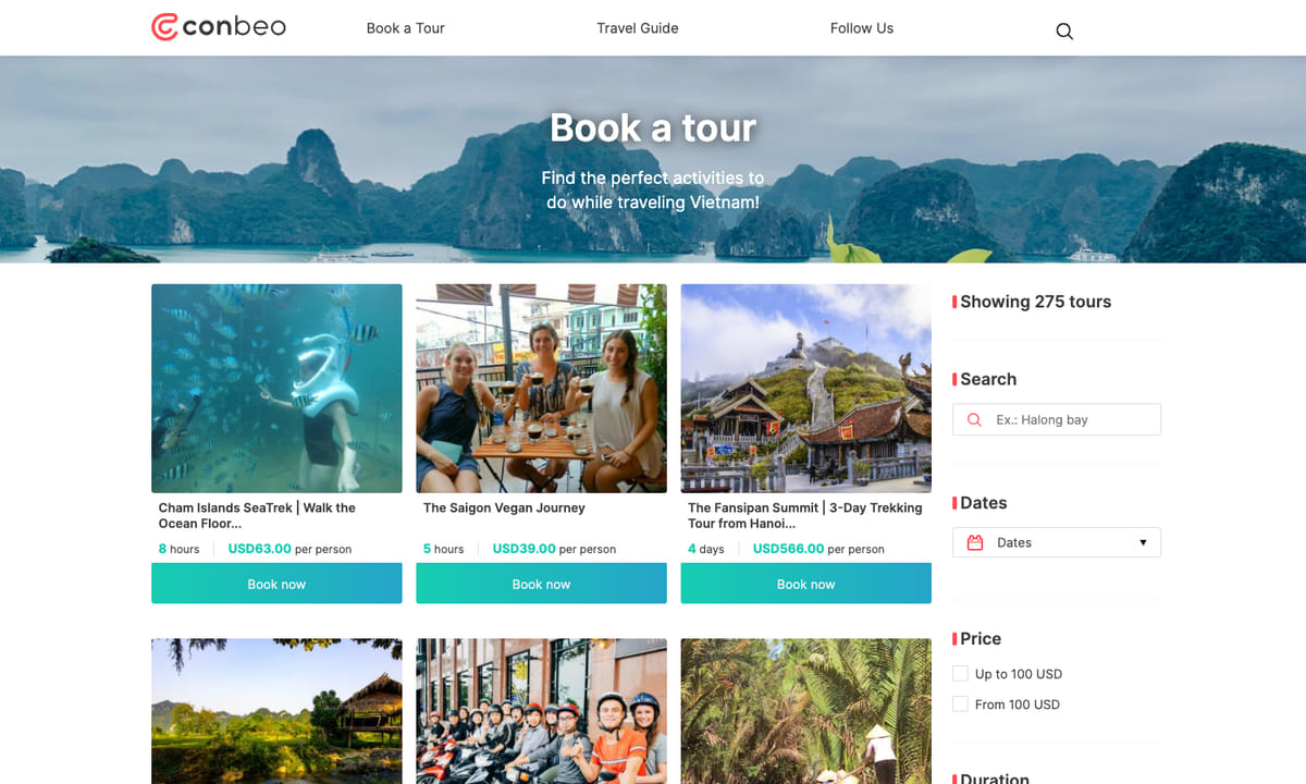 Conbeo is a marketplace for travel agents in Vietnam of which I am a co-founder and front-end developer. The travel companies can use our platform like an Airbnb for their tours. The system offers an administration panel where tours and bookings can be managed, plus an attractive website where those same tours get to be displayed and booked by visitors.