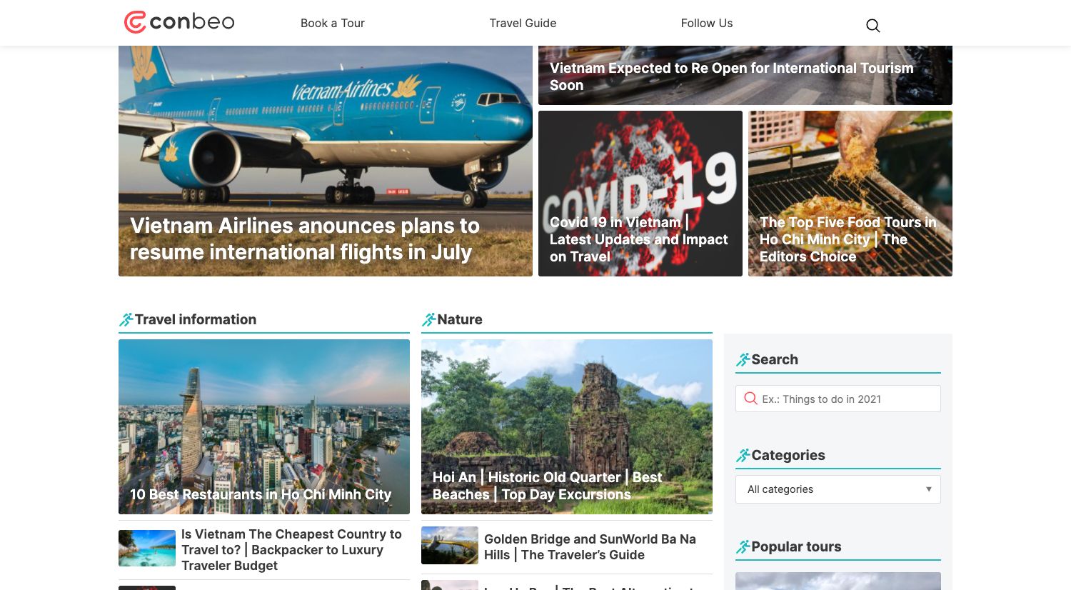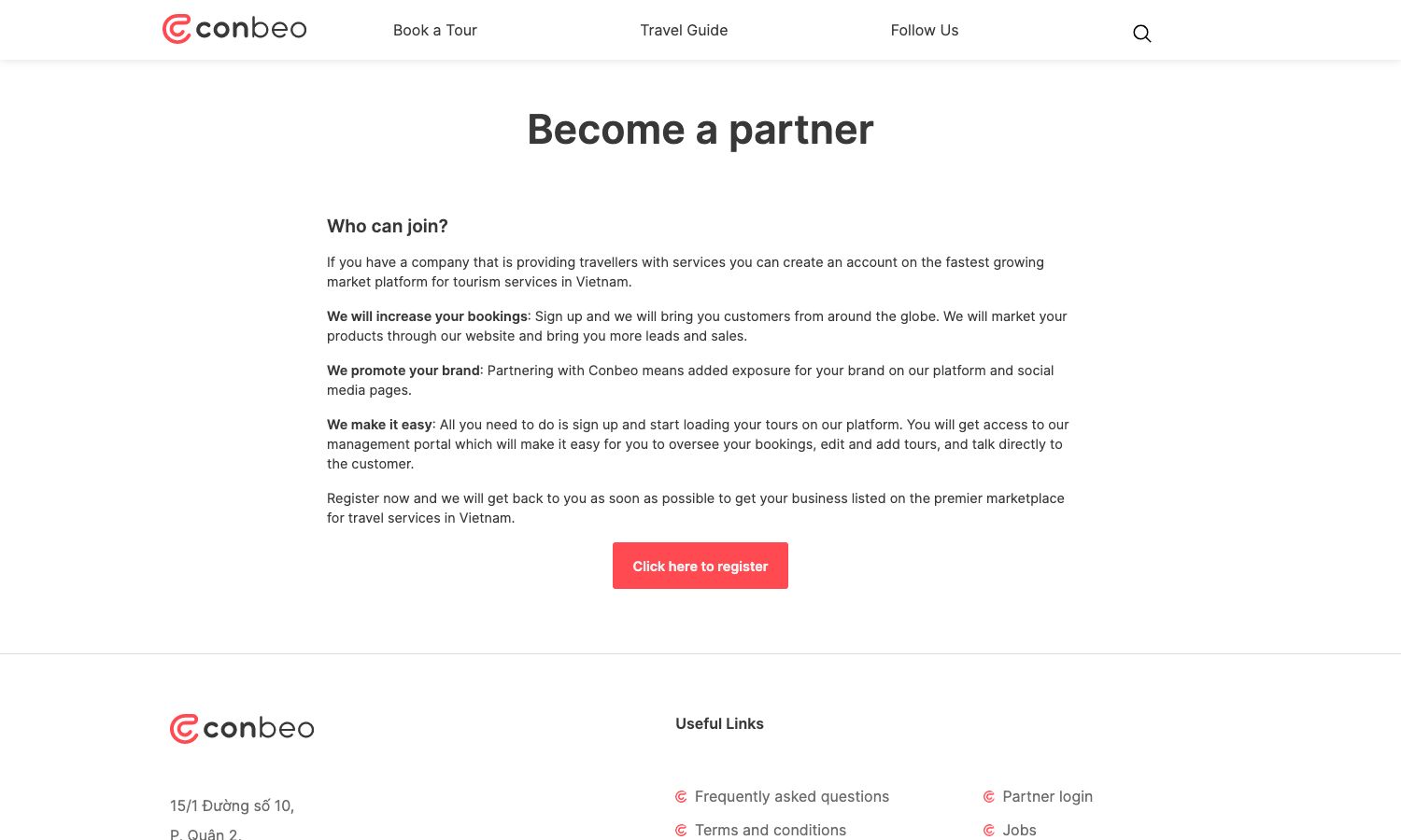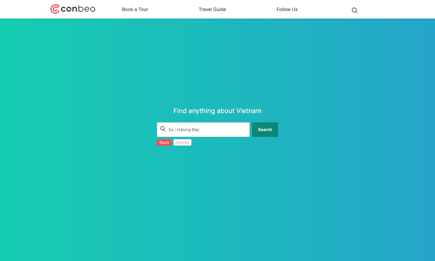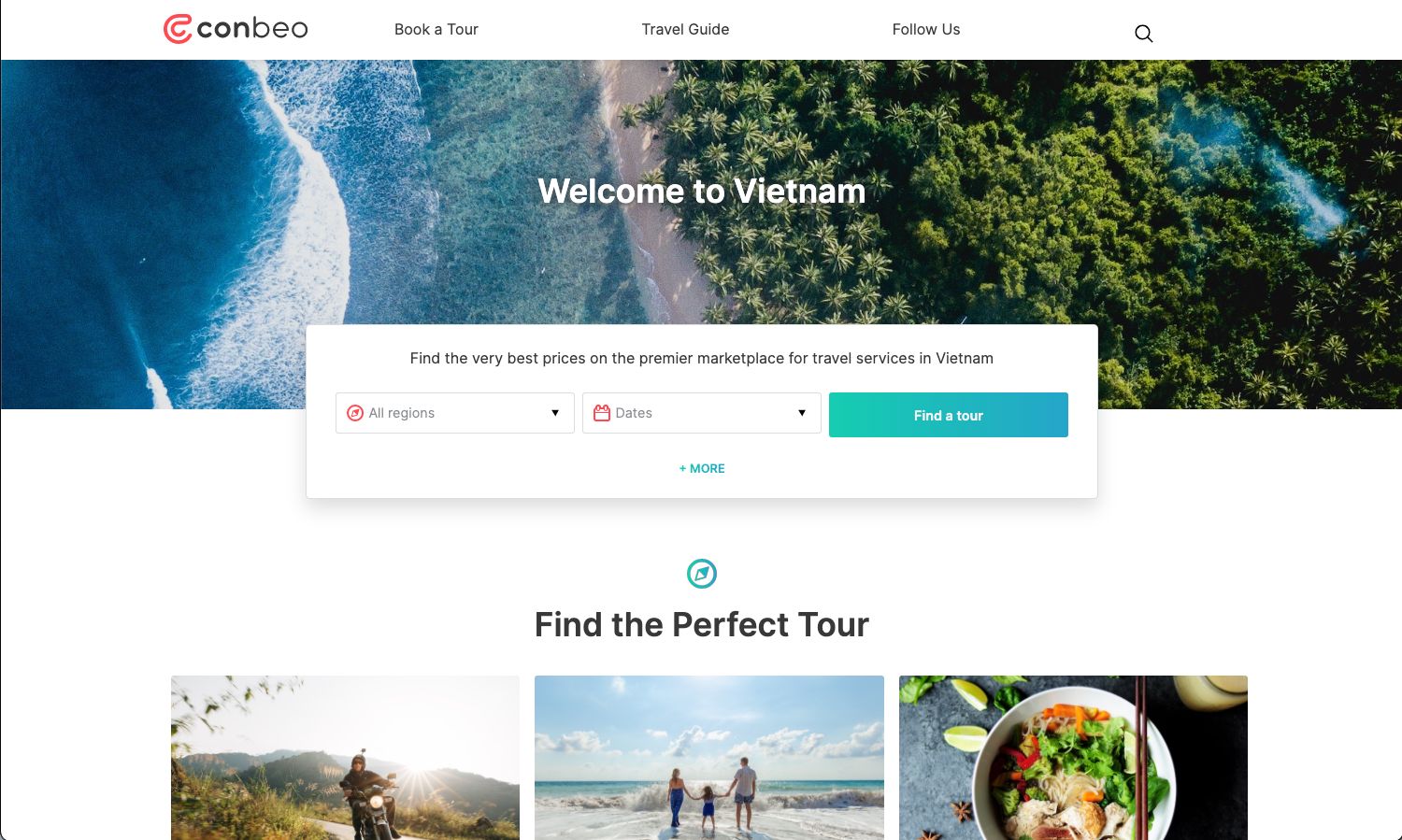 Conbeo is a marketplace for travel agents in Vietnam of which I am a co-founder and front-end developer. The travel companies can use our platform like an Airbnb for their tours. The system offers an administration panel where tours and bookings can be managed, plus an attractive website where those same tours get to be displayed and booked by visitors.