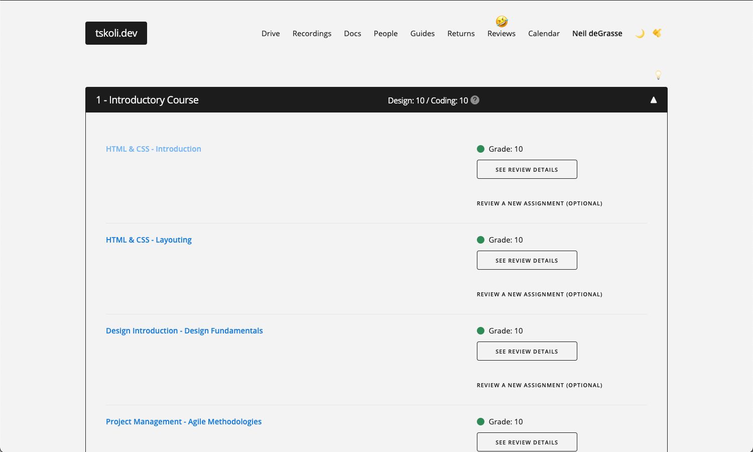 The reviews page shows the instances in wich the student has given some feedbad to a peer, and the grade they got for that feedback. On the top, it's possible to see the calculated grade for that module (the course has 8 Modules).