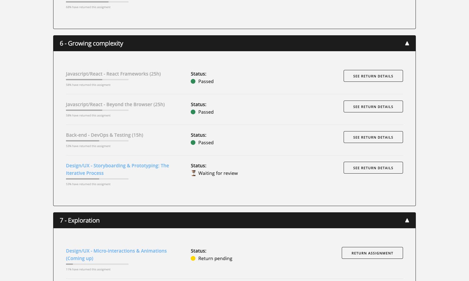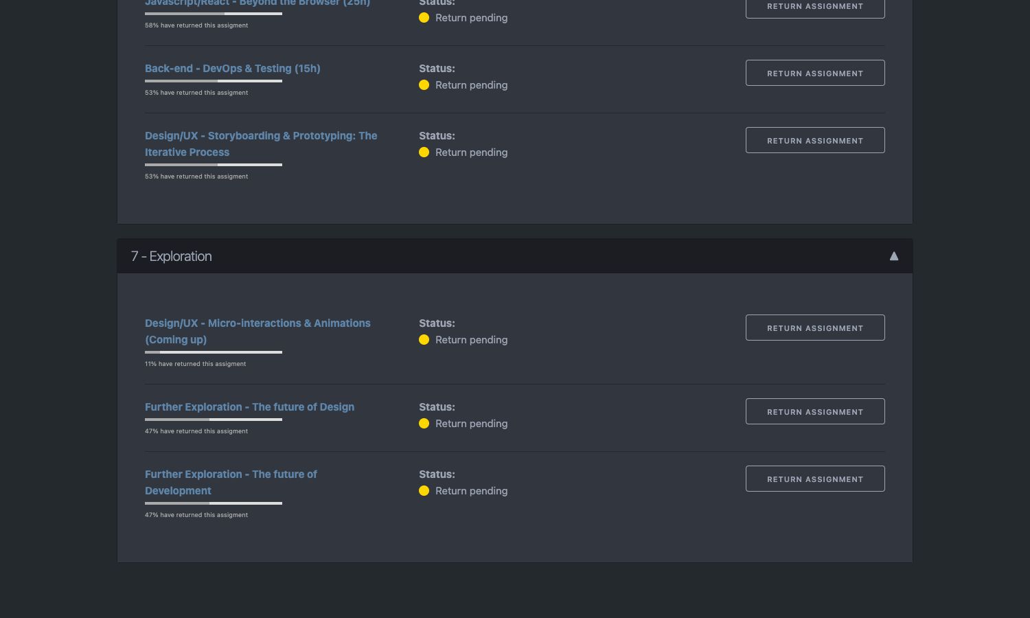 The Returns page gives an overview of all assignments. From there, the student can return their work, to be evaluated by their peers.
