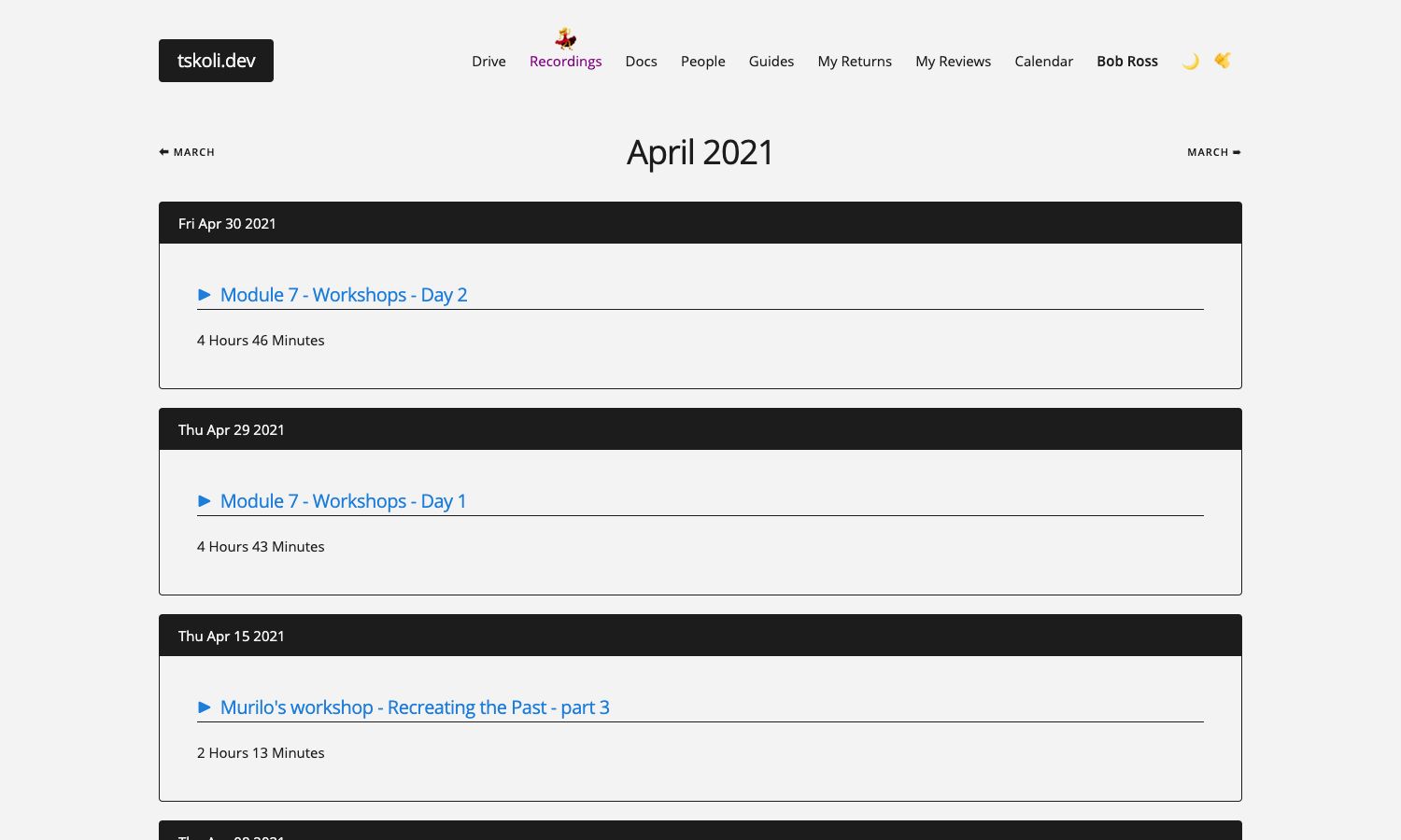 The Recordings page. All online classes, workshops and other important sessions are recorded and made available through this page.